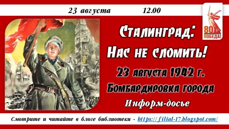 Приглашаем всех, интересующихся историей Великой Отечественной войны и Сталинградской битвы, в наш блог, где 23 августа в 12.00 появится первая публикация подборки воспоминаний, научных статей, биографий защитников города, стихов и песен о самой жестокой битве человечества.