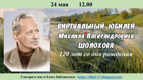 24 мая исполняется 120 лет со дня рождения Михаила Александровича Шолохова! Приглашаем вас на Виртуальный юбилей писателя, который начнётся 24 мая в 12.00 часов.