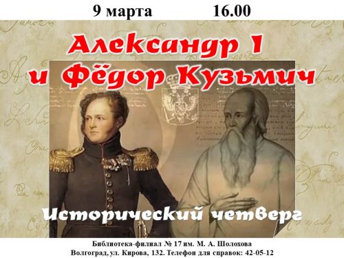 Был ли старец Фёдор Кузьмич Томский царём Александром I? Откуда возникла версия с подменой царя? Об этом пойдёт речь на очередной встрече лектория.