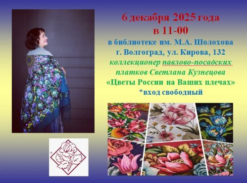 В ходе встречи вы узнаете историю Павло-Посадского платочного промысла и сможете посмотреть на коллекцию, включающую более 20 платков.