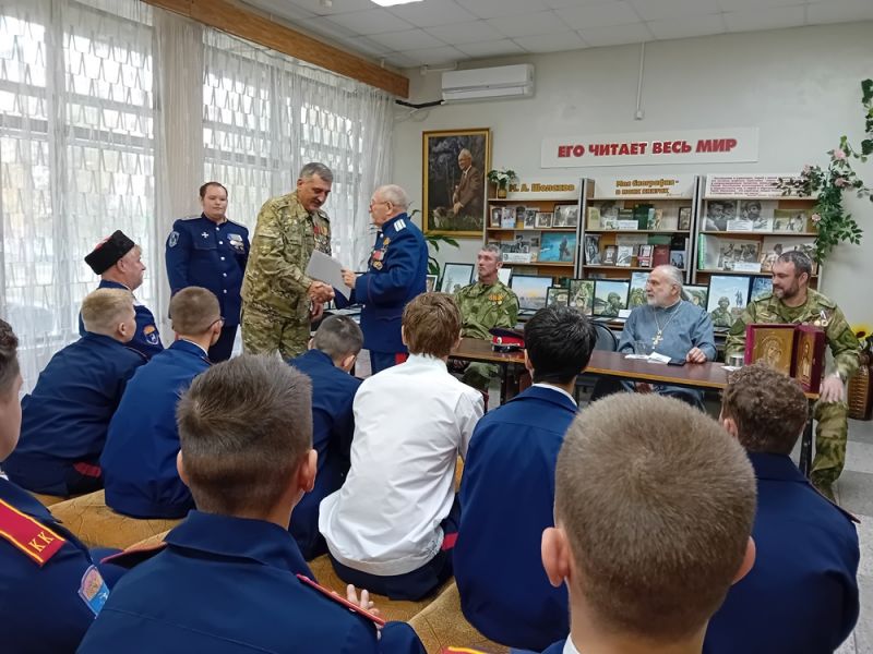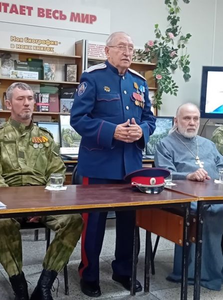 В ходе встречи ребята и пришедшие на встречу взрослые просмотрели три видеоролика, рассказывающих о подвигах казаков-участников спецоперации: «Путь к Великой Победе: Казаки на СВО» и ролики про Героев России Олега Валерьевича Ликонцева и Владимира Владимировича Попова.