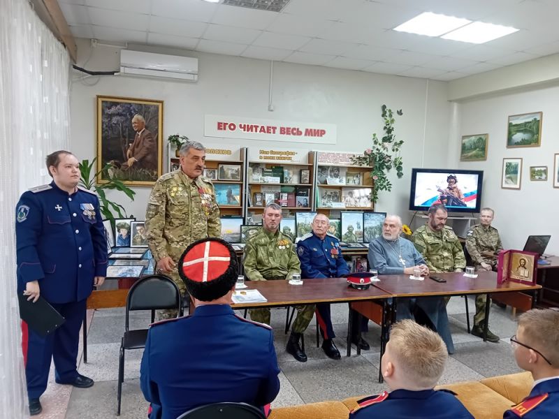 29 октября мы были рады стать площадкой патриотического проекта «Здравствуй, добрый человек!», в рамках которого прошла встреча «Диалог с казаками-Героями», участниками которого стали представители регионального отделения «Союза казаков-воинов России и зарубежья», казаки-участники СВО и кадеты казачьего класса МОУ СШ № 110. Гостей мероприятия встречала в казачьем костюме библиотекарь Васильева Светлана. На экране телевизора заставка «За Наших» подготовленная библиографом Урусовой М.Н. Оформлена выставка картин нашей читательницей Светланы Храброй «Наши герои».