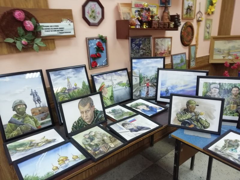 А еще выставка дополнилась работами Светланы Храброй, выполненные акварелью. Сама Храбрая бывала на Донбассе, встречалась с бойцами СВО, фотографировала их, а затем выполняла работы акварельными красками. Работы уникальные, потому что на рисунках достоверные лица: Прилепин, Захарченко, солдаты разведки, штурмовики и даже их друзья-собаки и кошки. Выставка отличается яркостью, выразительностью и сдержанным вкусом. Читатели задерживаются у выставки, вглядываются в лица солдат, оценивают работы этой самобытной художницы.