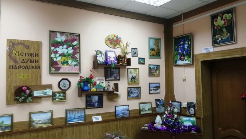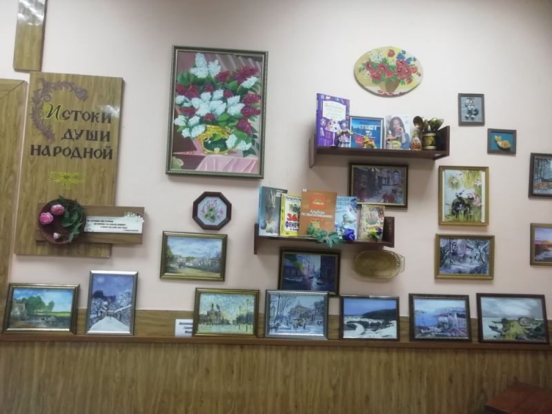 Выставка «Истоки души народной», которая находится в литературно-музыкальной гостиной нашей библиотеки, всегда привлекает внимание наших и читателей, и просто посетителей. На ней представлены книги и журналы по народному творчеству, работы, выполненные разной техникой: вышивка, лепка, декоративное плетение, рисунки-акварели и другое, выполненные нашими же читателями (Асиянов.С., Асиянов П., Галичкин М. и др.)