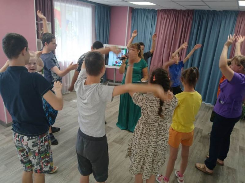Чтобы ребята долго не засиживались на месте, Васильева Светлана вызвала их в круг, где они должны были делать незатейливые упражнения в хороводе под музыкальное сопровождение. А музыкальным сопровождением была песня «Оранжевое лето», которую для ребят и исполнила Васильева Светлана. После разминки попросила ребят ответить на вопросы: каким цветом в песне было небо, река, одуванчики, лес и так далее. Так что детям пригодилось быть внимательными всегда, во время всего мероприятия.
