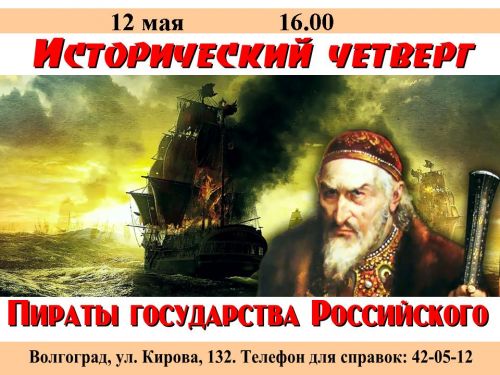 Исторический четверг продолжает работу и приглашает любителей истории 12 мая в 16.00 на лекцию «Пираты государства Российского». Речь пойдёт о капёрах Ивана Грозного.