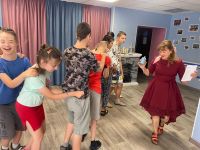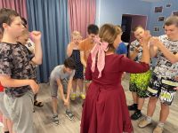 Затем, Васильева Светлана предложила ребятам самим отправиться в увлекательное, но «опасное» путешествие по этой самой дорожке из желтого кирпича. Для этого она подготовила небольшие желтые квадратики, которые и послужили имитацией дорожки. Взявшись за руки, дети должны были под песню Элли, которую исполнила под музыкальное сопровождение ведущая мероприятия, пройти весь назначенный путь, не наступая на желтые квадратики, а огибая их. Затем ребята встали в круг вокруг ведущей и под специальные стихотворения повторяли движения вслед за ведущей. Кроме того, стихотворения были визитными карточками самих главных героев и рассказывали о них. Например, ребята, чтобы помочь Страшиле обрести мудрость, собрали буквы, которые дала им ведущая и сложили единое слово «Дружба». А также танцевали вместе с Элли и повторяли несложные движения по смыслу стихотворения.