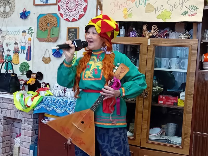 Я -«Скоморох» - ответила Васильева Светлана: «Пришел с вами Зиму провожать, да Масленицу встречать, с песнями, танцами, музыкой и шутками!». И затем библиотекарь спела для гостей веселую песню «Балалаечка».