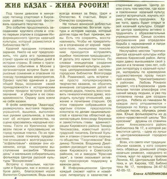 15. Васильева, С. Жив казак – жива Россия (По станице Вёшенской) / С. Васильева. // Новости Сарепты. – 2010. – 7 июля. – С.6.