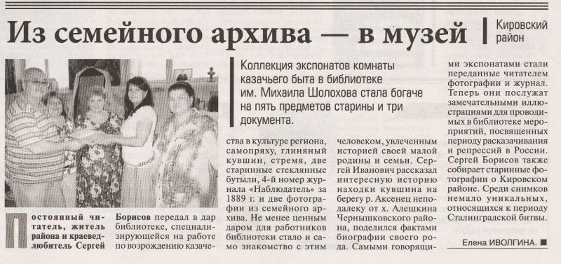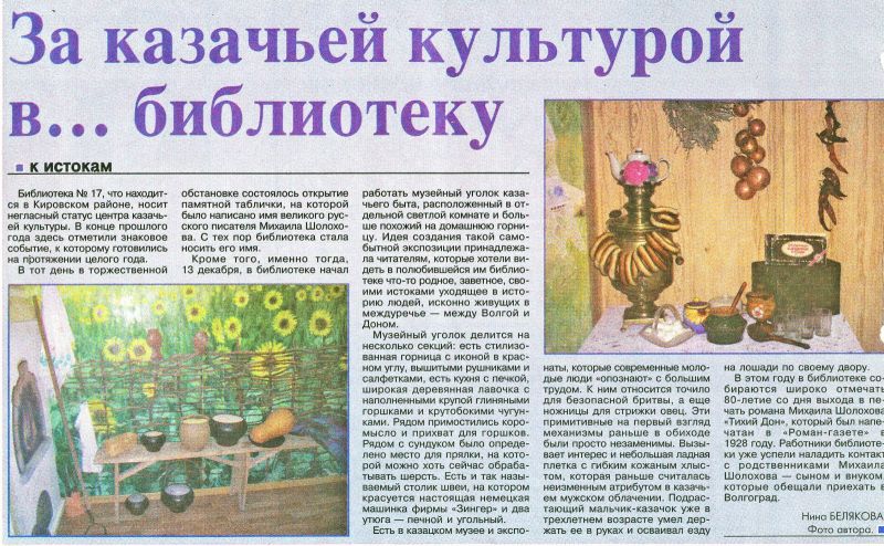 41. Гришина, Л. Музей казачьего быта в библиотеке № 17 г. Волгограда: [беседа с заведующей библиотекой Л. Гришиной / записала Н. Виденина] // Казарла. – 2012. - № 6. – III, IV обложка.
