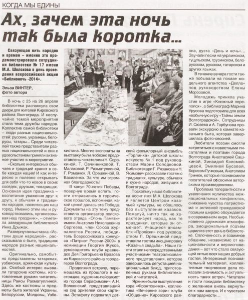 О работе библиотеки №17 Кировского района г. Волгограда с жителями района, о праздниках в стенах библиотеки.
