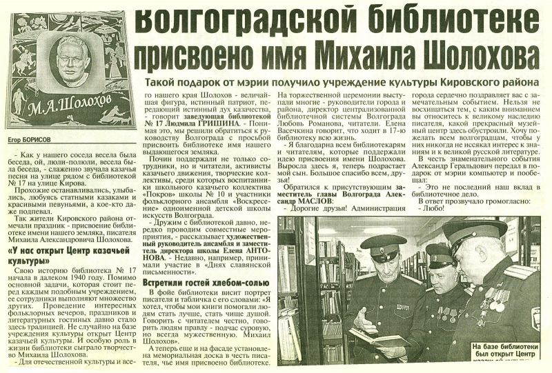 7. Борисов, Е. Волгоградской библиотеке присвоено имя Михаила Шолохова: Такой подарок от мэрии получило учреждение культуры Кировского района / Е.Борисов // КП-Волгоград – 2007. – 18 декабря. – С.21.