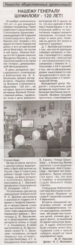 О памятном вечере, посвященном 120-летнему юбилею командира 64-й армии генерала М. С. Шумилова.