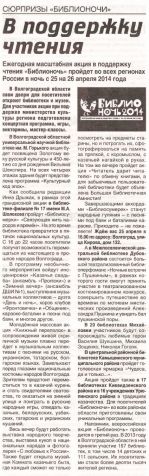 - В библиотеках Волгограда наступит «Библионочь» // Новости Волгограда. – 2015. – 24 апреля. – Режим доступа : http://volgograd-news.net/culture/2014/04/24/12718.html