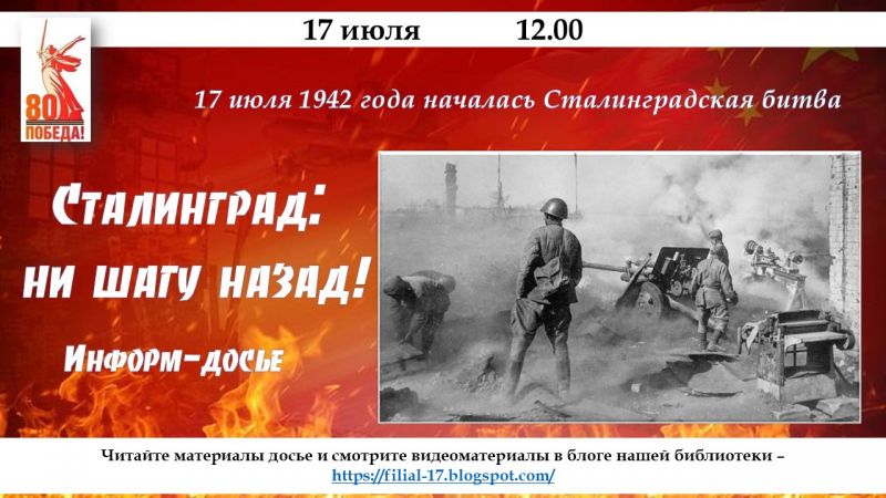Приглашаем вас 17 июля в 12.00 посетить блог нашей библиотеки https://filial-17.blogspot.com/ , чтобы ознакомиться с воспоминаниями участников Сталинградской битвы, статьями историков, стихами, песнями, документальными фильмами, посвящёнными главной битве Великой Отечественной войны.