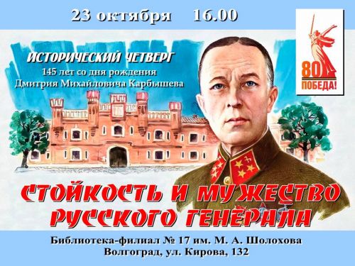 Предваряя 145-летие выдающегося фортификатора, мужественного и стойкого человека, в читальном зале библиотеки пройдёт лекция «Стойкость и мужество русского генерала» (лекторий «Исторический четверг»), на которую мы приглашаем всех любителей и ценителей отечественной военной истории.