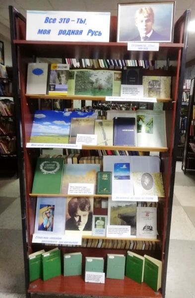 Годовая выставка «Все это - ты, моя родная Русь» посвящена 125-летию со дня рождения С.Есенина и оформлена на абонементе нашей библиотеки. Выставка включает несколько подразделов, на которых представлена литература о творчестве поэта, о его жизненном пути и, конечно же, представлены сами произведения автора.