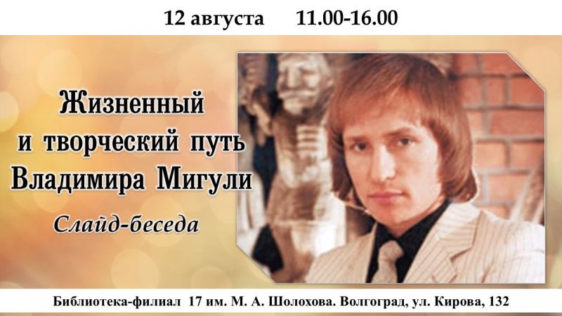 К юбилею автора первого космического гимна – песни «Трава у дома» - библиотека подготовила слайд-беседу «Жизненный и творческий путь Владимира Мигули», которая будет демонстрироваться в течение дня для посетителей абонемента библиотеки 12 августа.